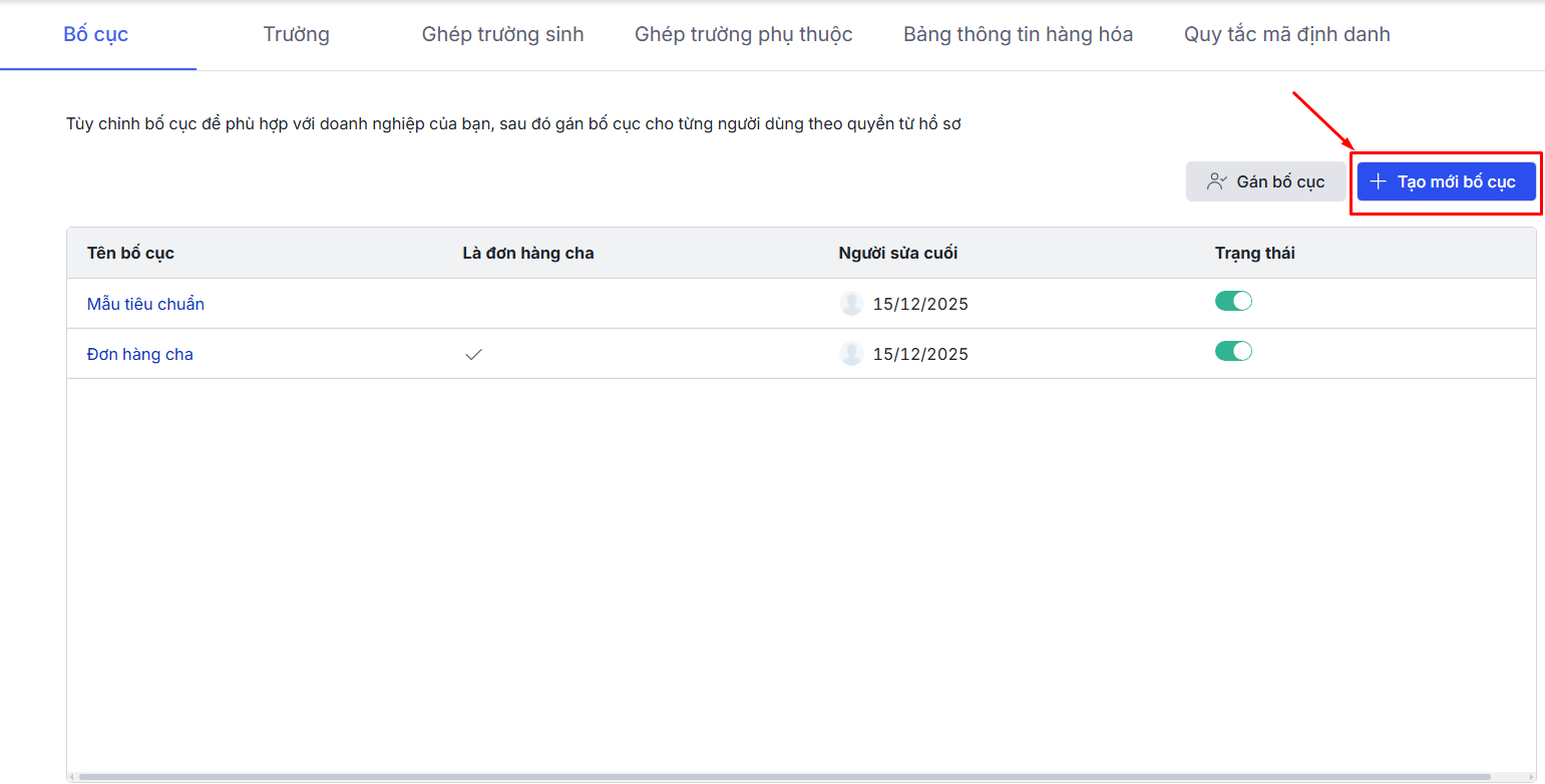 Lưu ý: Tiếp theo thiết lập các trường thông tin cho bố cục mới. Xem hướng dẫn chi tiết tại đây.