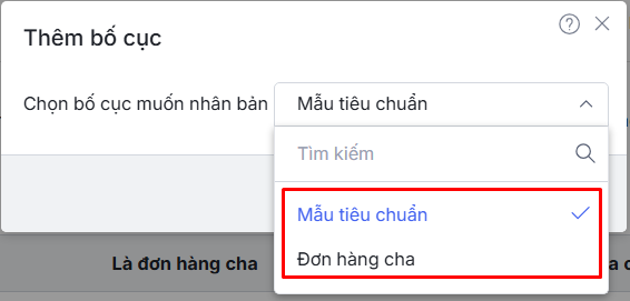 • Nếu chọn nhân bản bố cục Mẫu tiêu chuẩn: Bố cục mới tạo sẽ không tích chọn thông tin Là đơn hàng cha.
