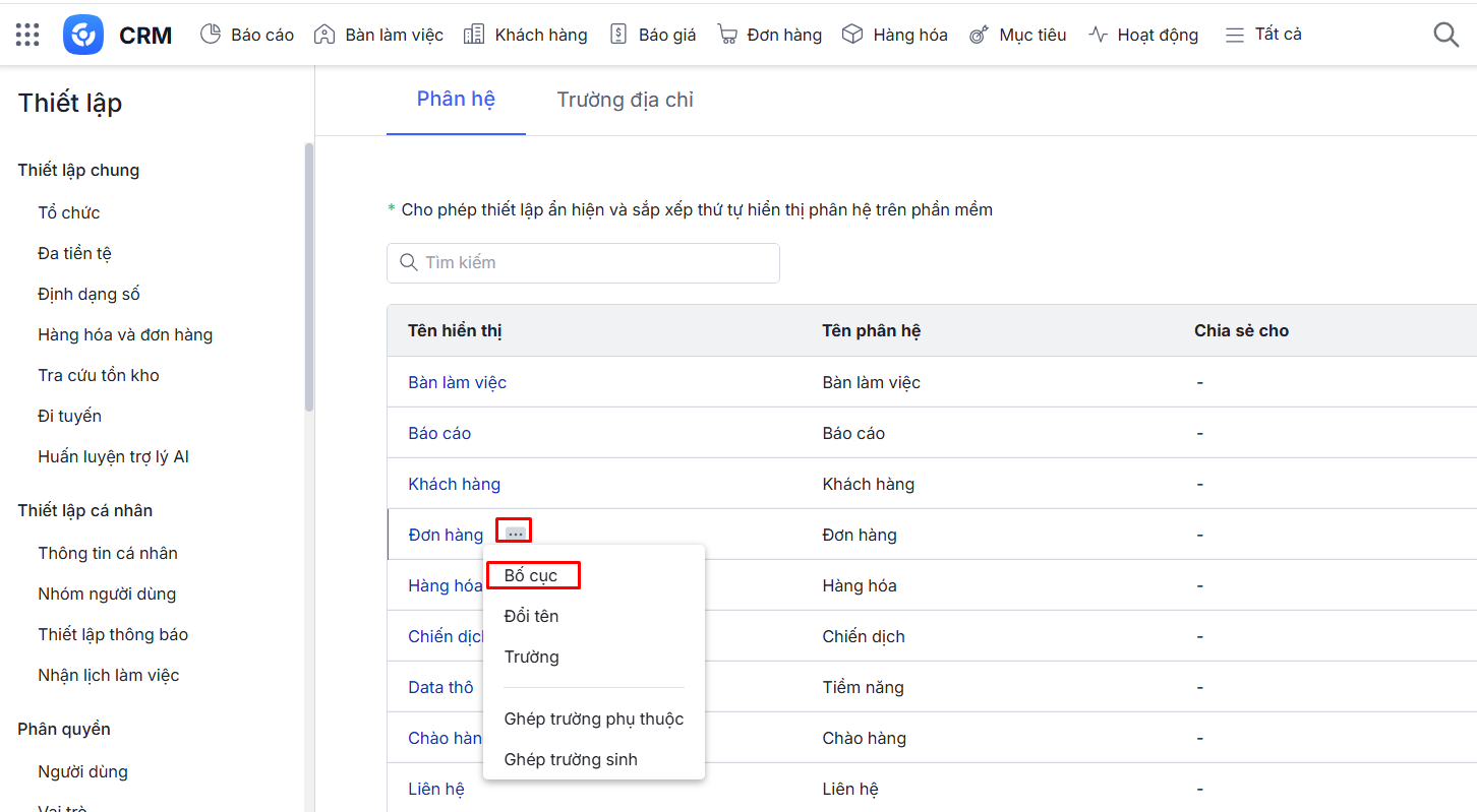 Bước 2: Di chuột vào dòng phân hệ Đơn hàng\ Nhấn biểu tượng dấu ba chấm \ Chọn Bố cục. (Hoặc nhấn đúp vào phân hệ Đơn hàng).