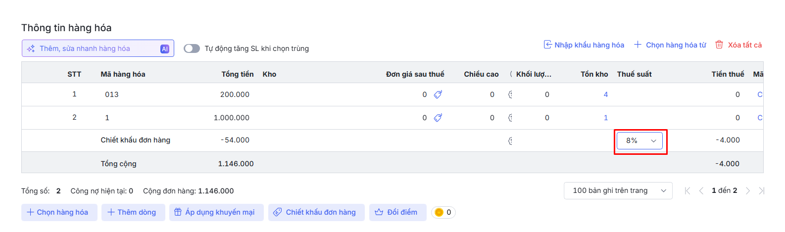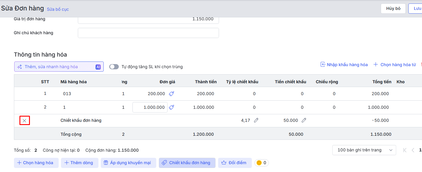 Bước 4: Tại dòng thông tin chiết khấu đơn hàng, có thể thực hiện các thao tác: