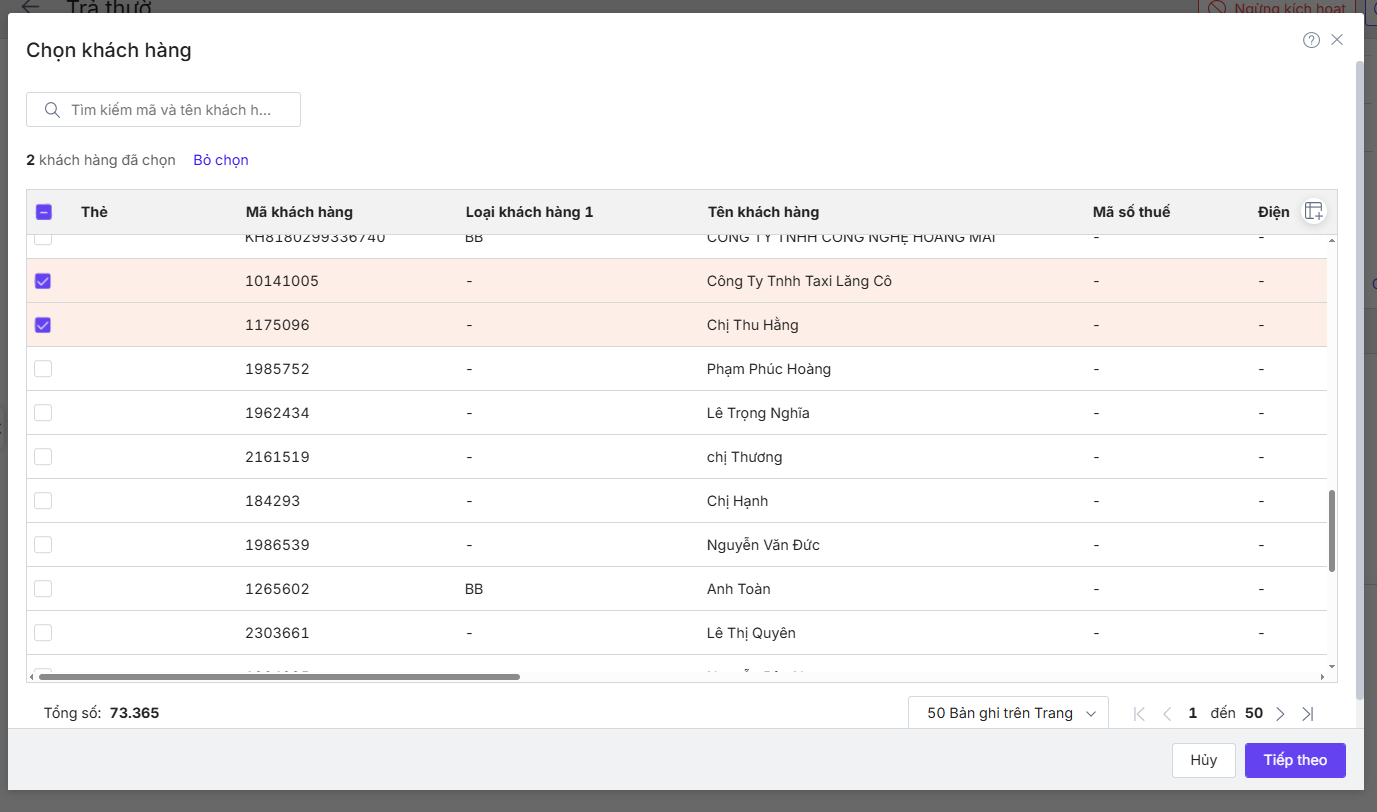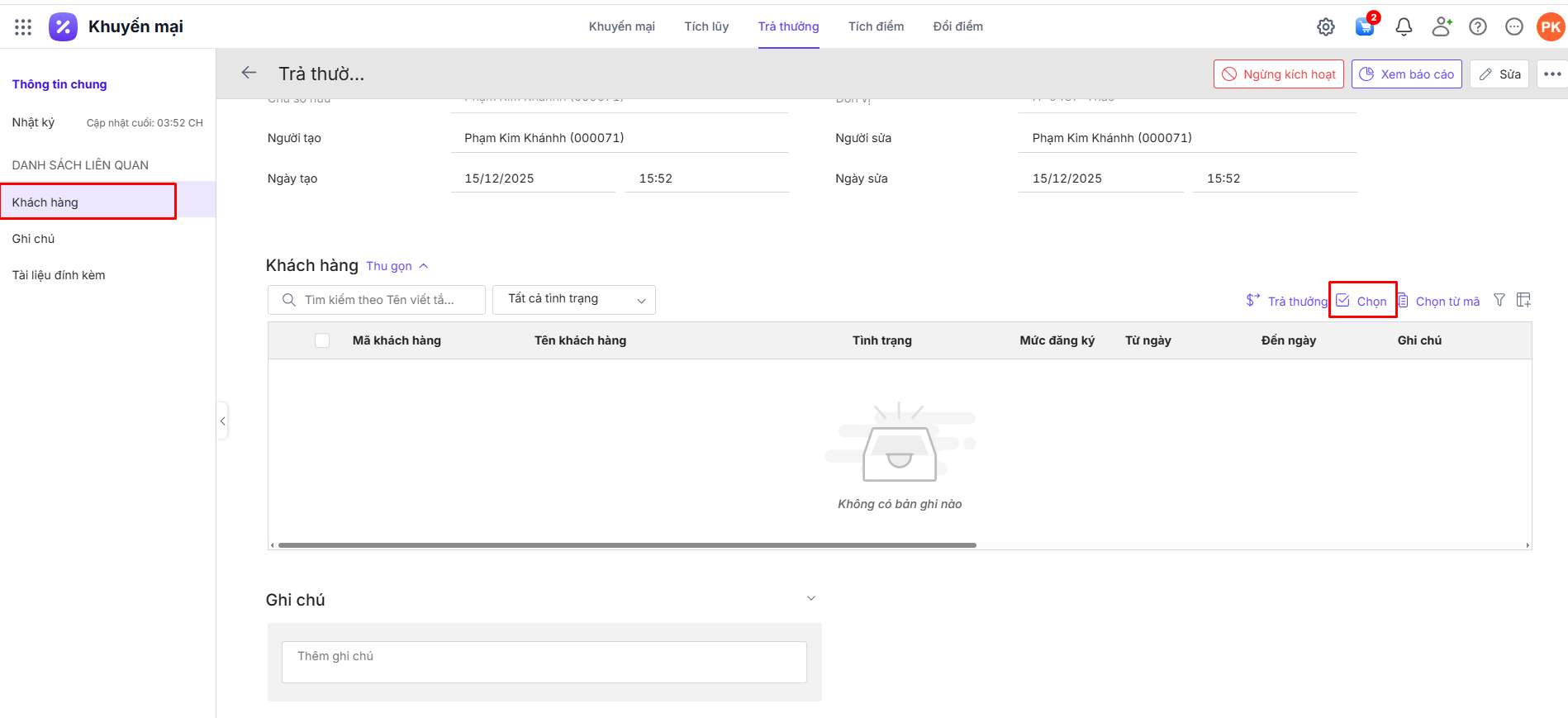 Bước 3: Ở mục Khách hàng tham gia \ Chọn Khách hàng \ Khi thêm thông tin đăng ký của Khách hàng, khai báo thông tin Từ ngày, Đến ngày đăng ký chương trình trả thưởng.