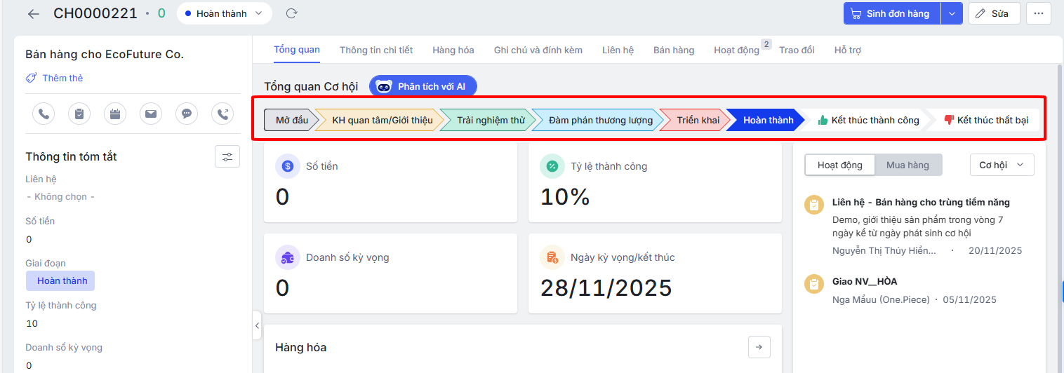4.1. Cập nhật giai đoạnCách 1: Nhấn vào icon trên thanh Giai đoạn để chuyển giai đoạn của Cơ hội.