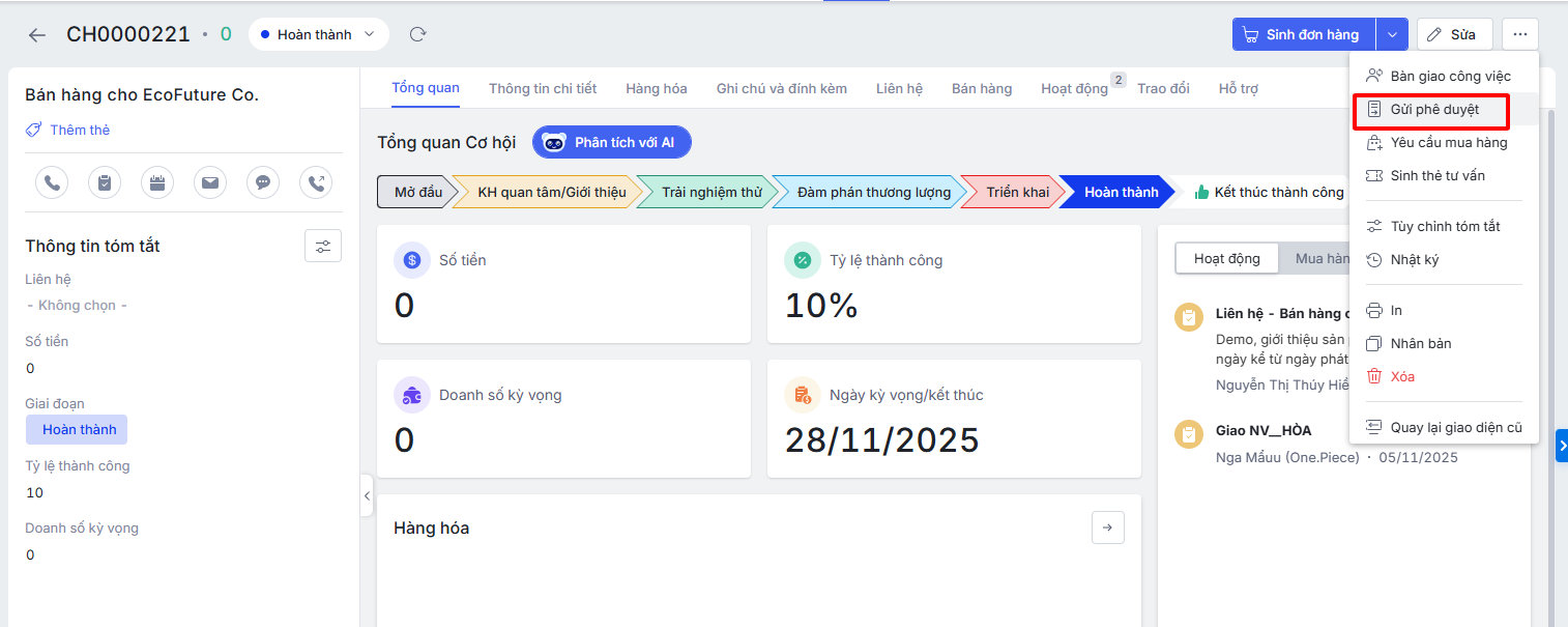4.6. Gửi phê duyệtTại chi tiết bản ghi Cơ hội, nhấn biểu tượng ba chấm ⋯ và chọn Gửi phê duyệt.