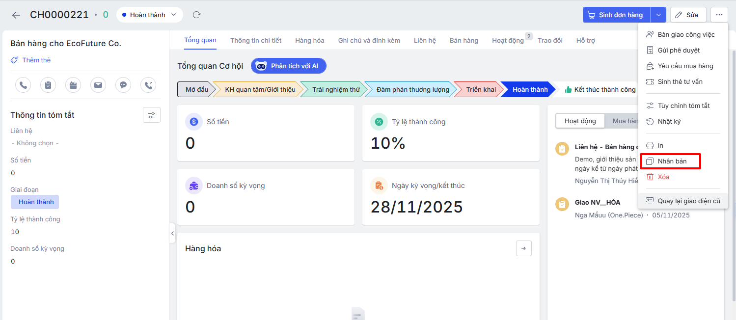 Xem hướng dẫn thực hiện chi tiết tại đây. 4.8. Nhân bảnTại chi tiết bản ghi Cơ hội, nhấn biểu tượng ba chấm ⋯ và chọn Nhân bản