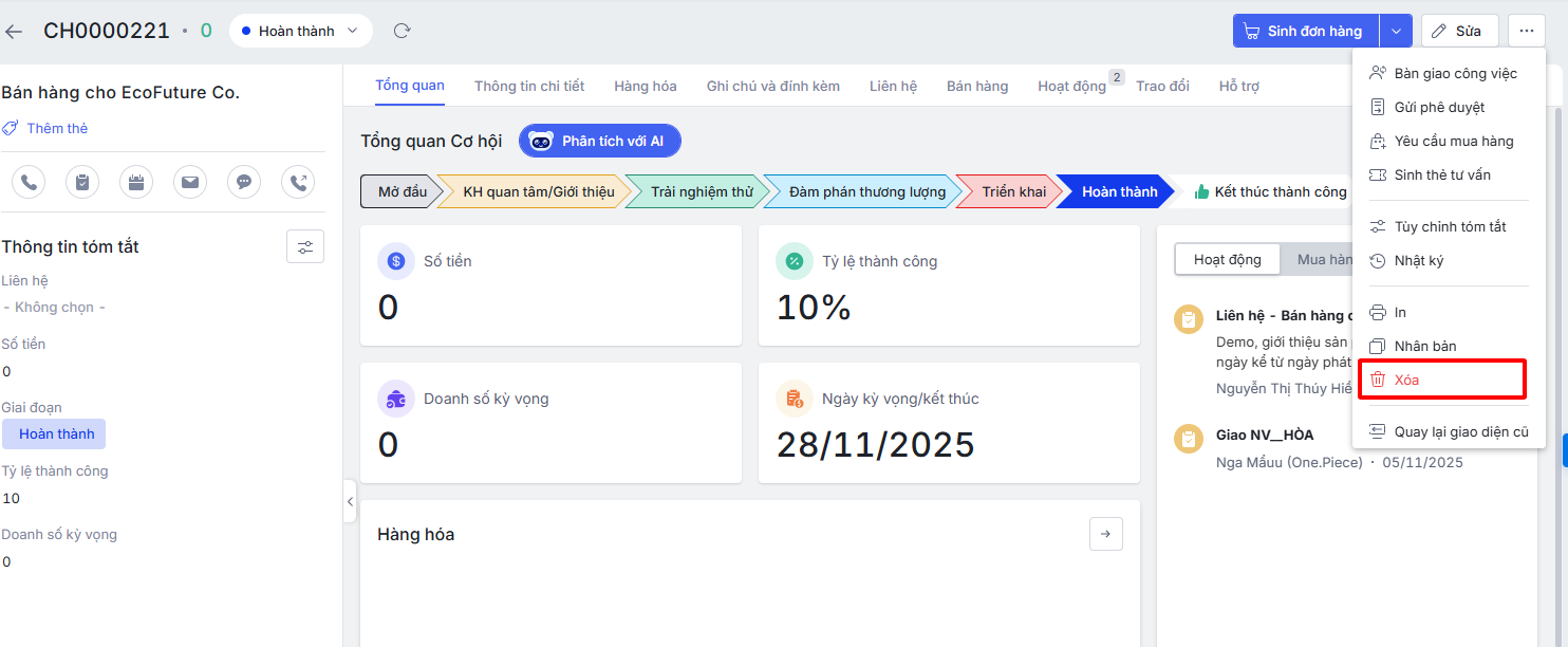 - Xử lý chi tiết bản ghi Cơ hội: cập nhật giai đoạn, sinh đơn hàng, sinh báo giá, sửa, bàn giao công việc, gửi phê duyệt, tùy chỉnh tóm tắt, nhân bản, chia sẻ, xóa, xem lịch sử giao dịch, quản lý danh sách liên quan