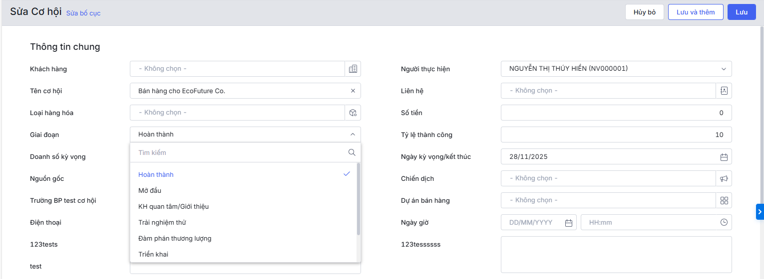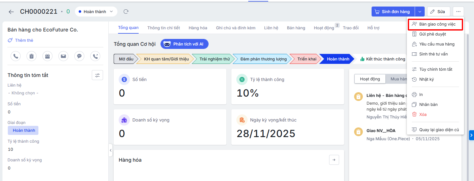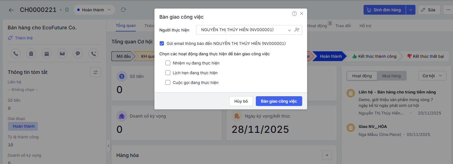 Bước 2: Sửa lại các thông tin của Cơ hội. Nhấn Lưu để hoàn thành. 4.5. Bàn giao công việcBước 1: Tại chi tiết bản ghi Cơ hội, nhấn biểu tượng ba chấm ⋯ và chọn Bàn giao công việc.