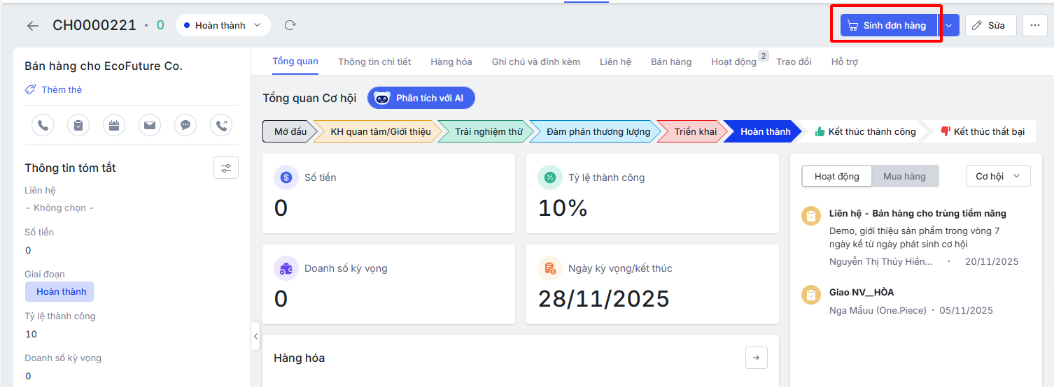 4.2. Sinh đơn hàngBước 1: Tại chi tiết bản ghi Cơ hội, nhấn Sinh đơn hàng.