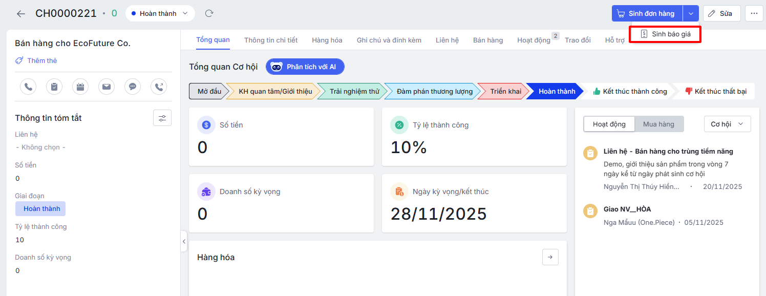 Bước 2: Phần mềm tự động lấy các thông tin từ Cơ hội sang Đơn hàng. Anh/Chị khai báo các thông tin, nhấn Lưu để tạo đơn hàng ![]() 4.3. Sinh báo giáBước 1: Tại chi tiết bản ghi Cơ hội, nhấn biểu tượng mũi tên xuống ⏷ và chọn Sinh báo giá.