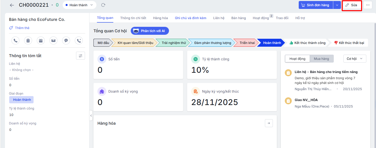 Bước 2: Phần mềm tự động lấy các thông tin từ Cơ hội sang Báo giá. Anh/Chị khai báo các thông tin, nhấn Lưu để tạo báo giá. ![]() 4.4. Sửa Cơ hộiBước 1: Tại chi tiết bản ghi Cơ hội, nhấn Sửa.