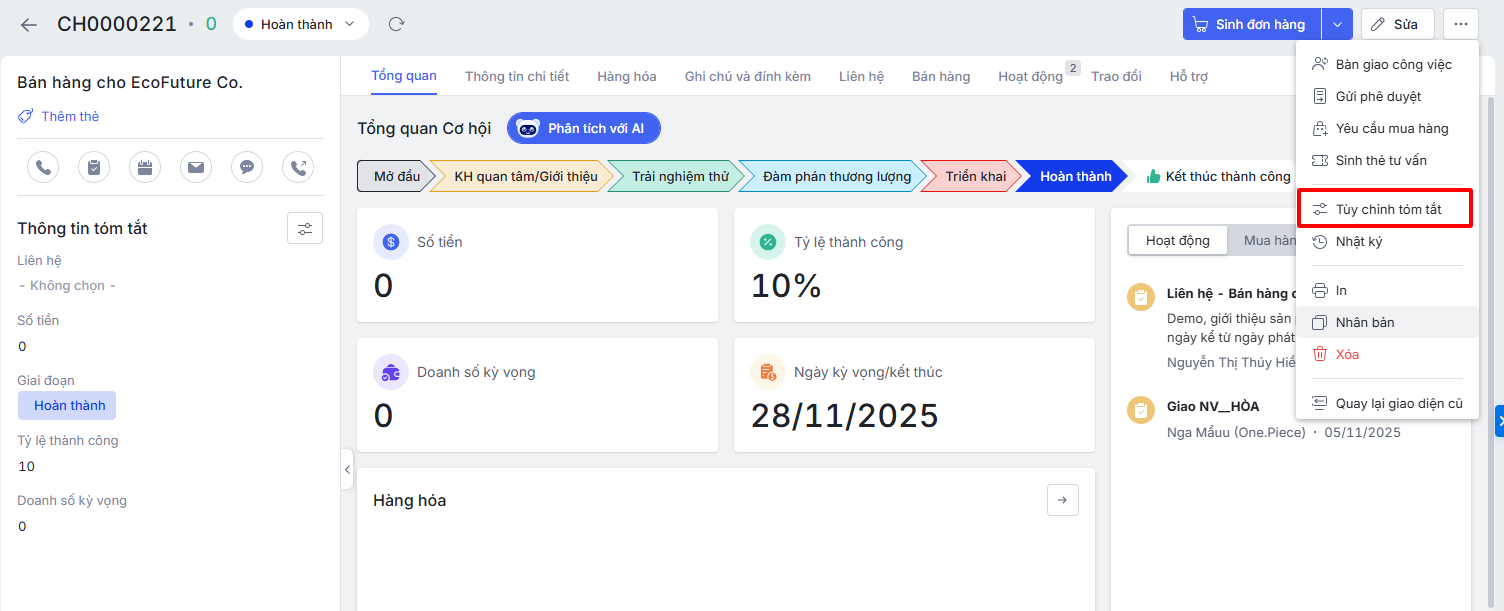 4.7. Tùy chỉnh tóm tắtTại chi tiết bản ghi Cơ hội, nhấn biểu tượng ba chấm ⋯ và chọn Tùy chỉnh tóm tắt.