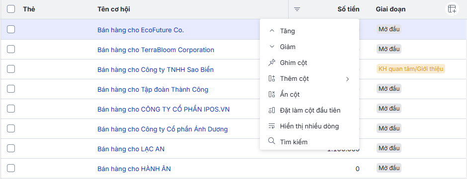 3.5. Sắp xếp thứ tự hiển thị thông tin trong cộtTại danh sách Cơ hội, nhấn vào Tiêu đề cột và chọn Chức năng tương ứng