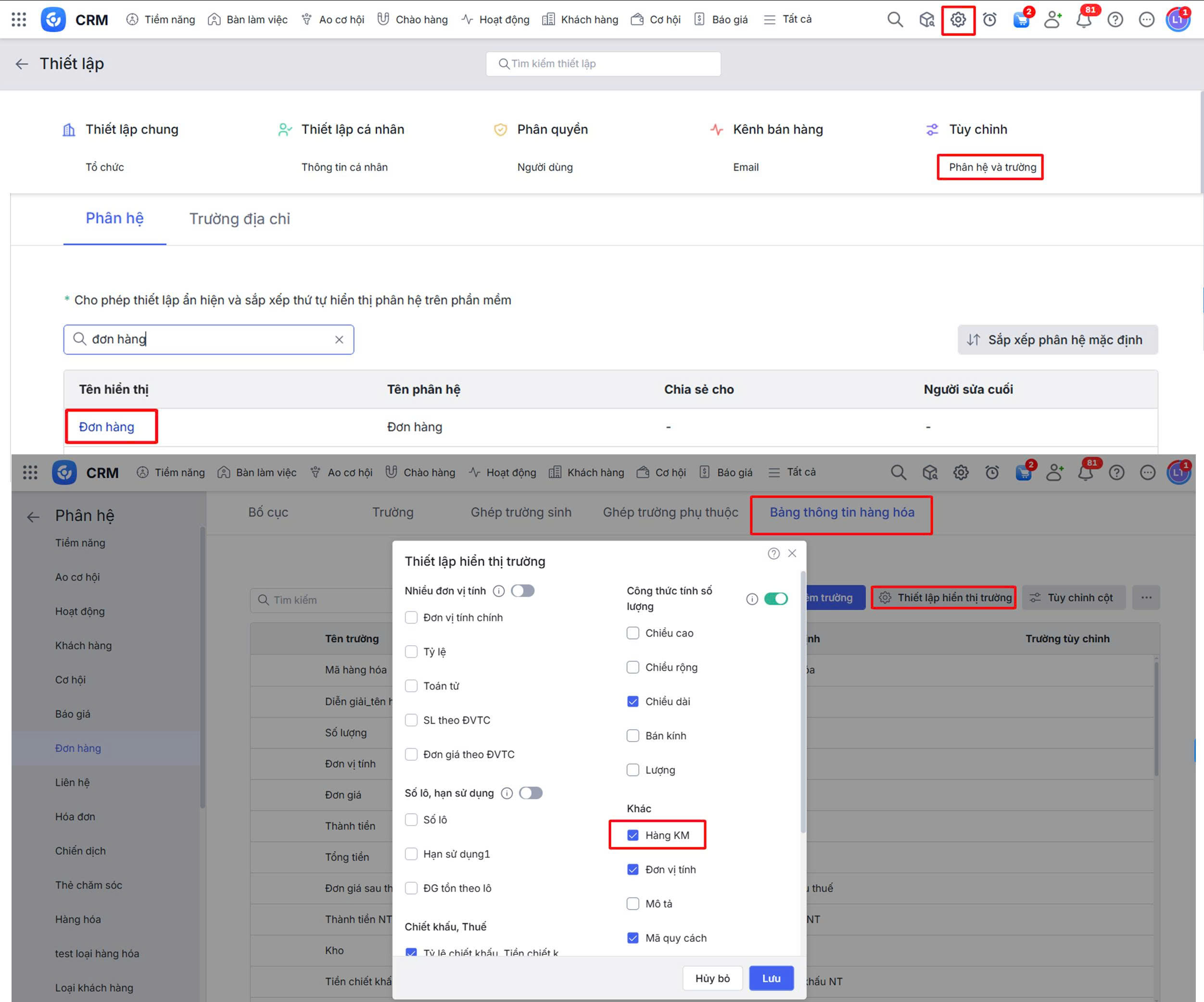 - Vào bánh răng ⚙ \ mục Tùy chỉnh chọn Phân hệ và trường