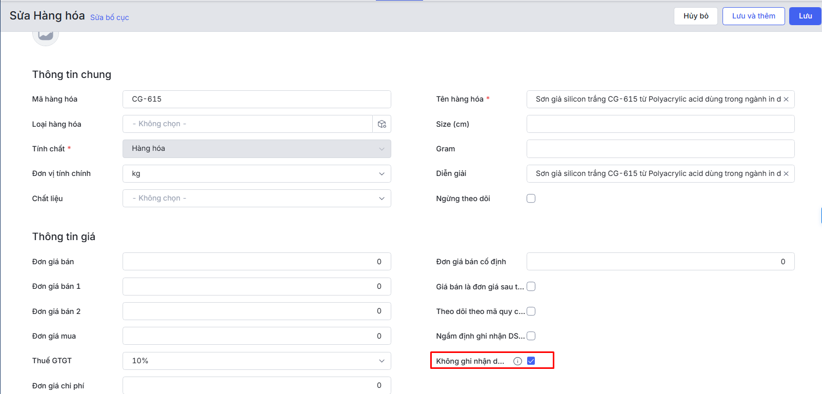Lưu ý: Nếu Thêm/Sửa hàng hóa không thấy có trường thông tin Không ghi nhận thông tin để tích, thì cần sửa mẫu bố cục lấy lên trường thông tin này. Xem hướng dẫn chi tiết tại đây.