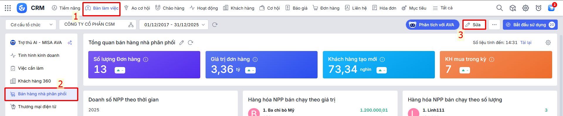 Bước 1: Trên AMIS CRM, vào phân hệ Bàn làm việc \ giao diện Bán hàng nhà phân phối \ nhấn Sửa