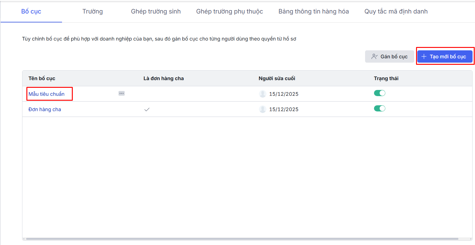 Bước 3: Tại Tab Bố cục\ Nhấn trực tiếp vào mẫu muốn sửa hoặc Thêm bố cục.