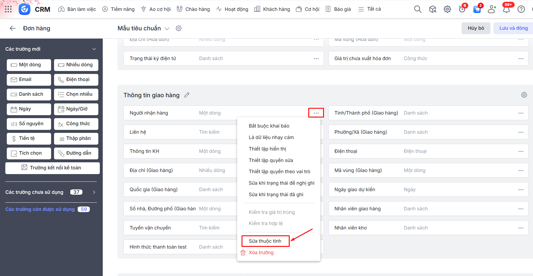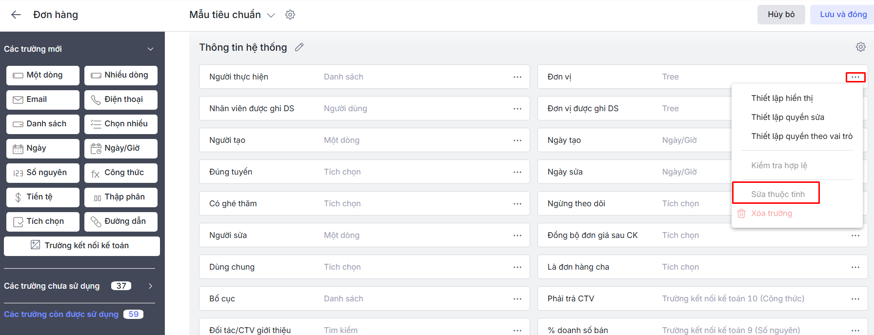 Lưu ý: Một số trường thông tin sẽ mang tính chất mặc định và không thể thay đổi tên trường hiển thị trên bản ghi chi tiết như: Đơn vị, Bố cục, … Biểu hiện là khi nhấn vào biểu tượng dấu ba chấm thì chức năng Sửa thuộc tính bị in mờ.