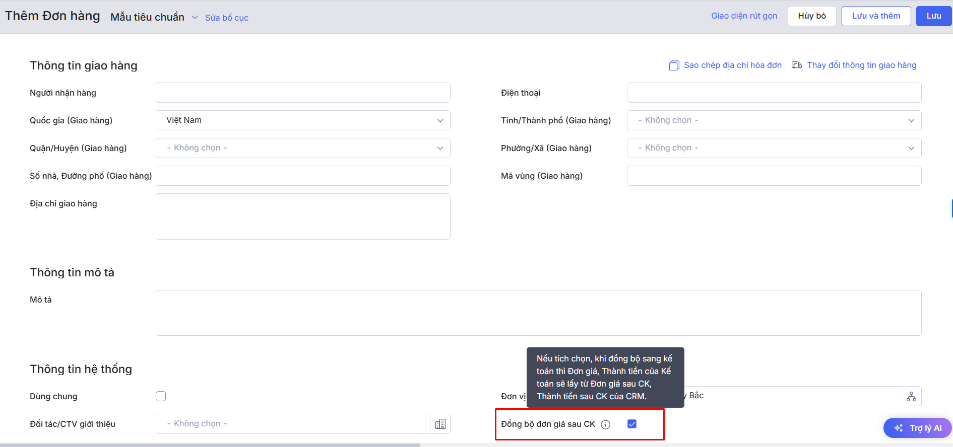 Bước 1: Khi Thêm/Sửa/Nhân bản đơn hàng\ Mục Thông tin hệ thống\ Tích chọn Đồng bộ đơn giá sau CK: