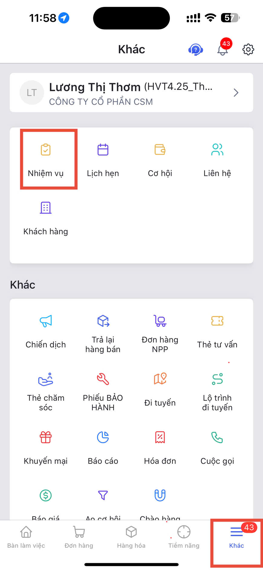 Bước 1: Trên AMIS CRM mobile, vào Khác, chọn phân hệ Nhiệm vụ.