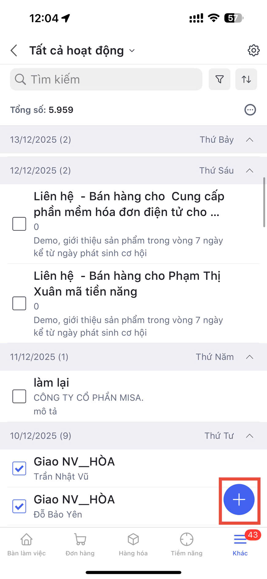 Bước 2: Ở phân hệ Nhiệm vụ, nhấn biểu tượng dấu cộng + để thêm nhiệm vụ.