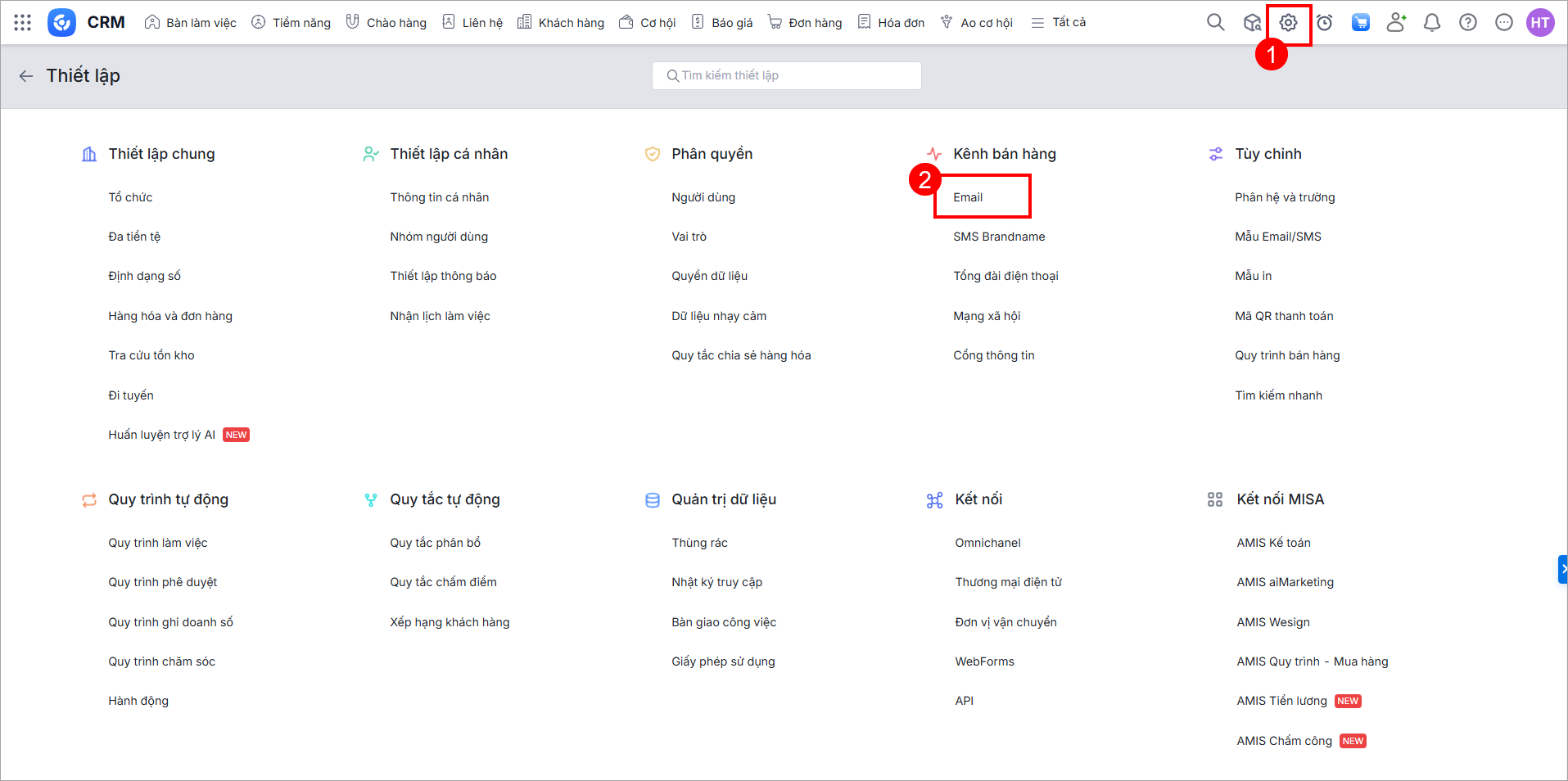 để hiển thị Thiết lập. Vào Kênh bán hàng\Email.
