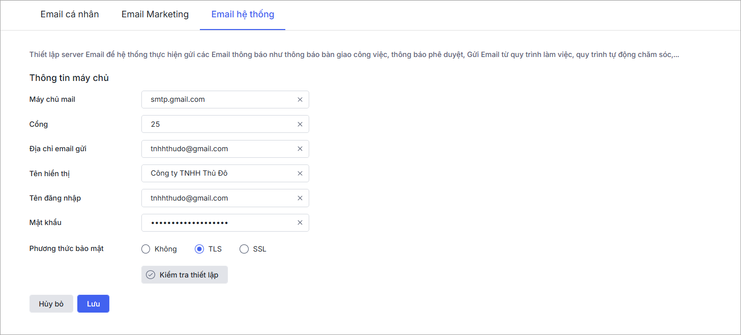 - Máy chủ mail, Cổng, Phương thức bảo mật: Nhập thông tin máy chủ và cổng của hệ thống gửi email của đơn vị.