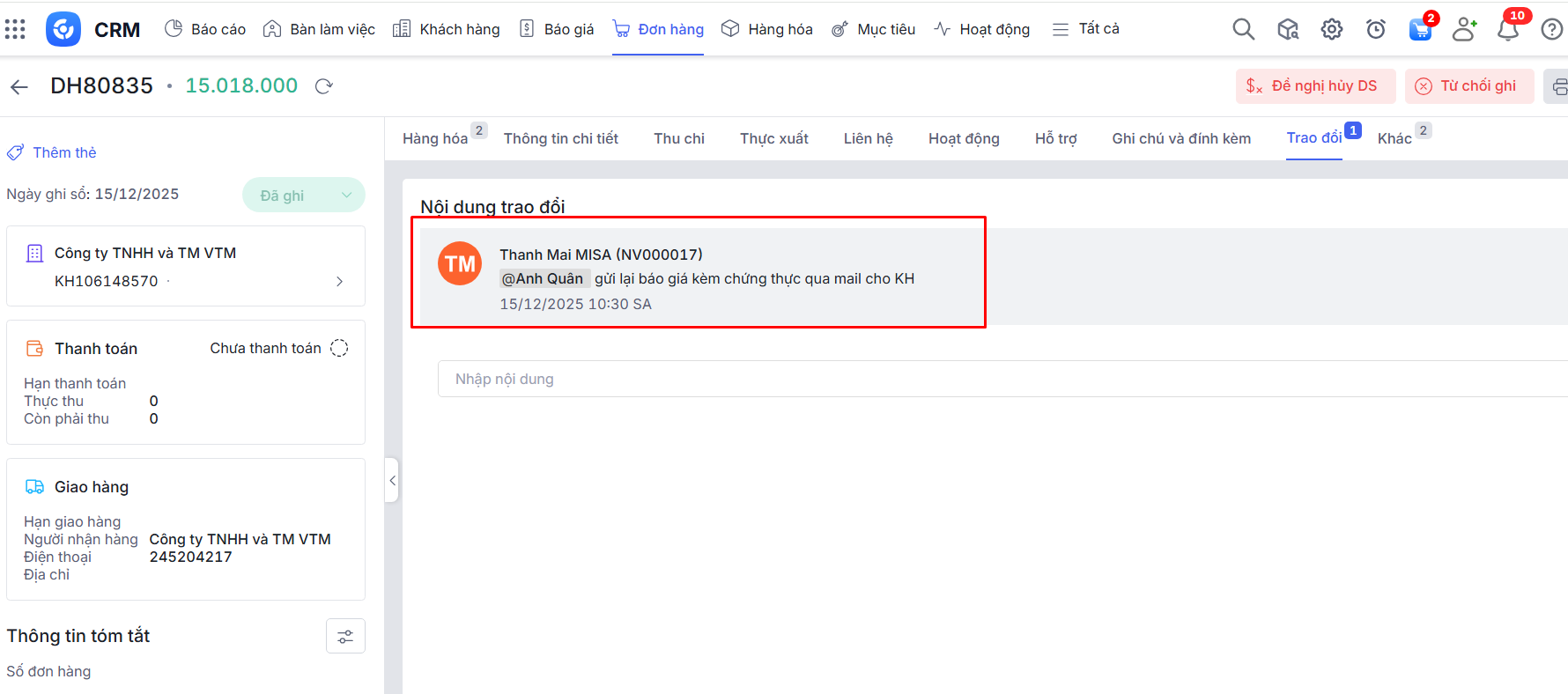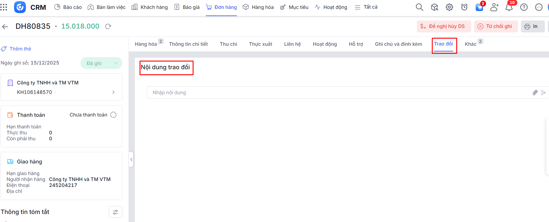 Bước 1: Ở chi tiết Đơn hàng/Thẻ tư vấn\ tab Danh sách liên quan Trao đổi\ Nội dung trao đổi.