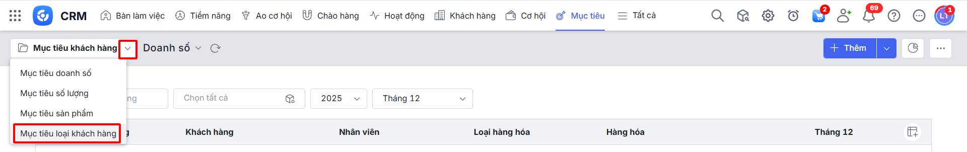 Bước 1: Vào phân hệ Mục tiêu \ nhấn biểu tượng mũi tên xuống ⏷ \ chọn Mục tiêu loại khách hàng \ Nhấn Thêm để thêm từng mục tiêu cho loại khách hàng.