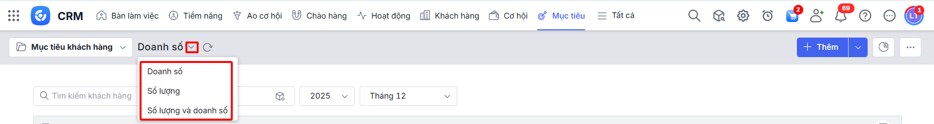 Bước 2: Vào mục Doanh số \ nhấn biểu tượng mũi tên xuống⏷ \ chọn Mục tiêu khách hàng theo Doanh số/Số lượng/Số lượng và Doanh số.