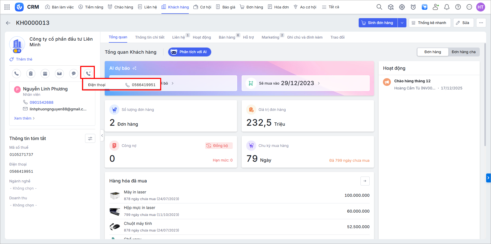 Ở chi tiết bản ghi Khách hàng, nhấn biểu tượng (Gọi điện) và chọn SĐT muốn gọi.