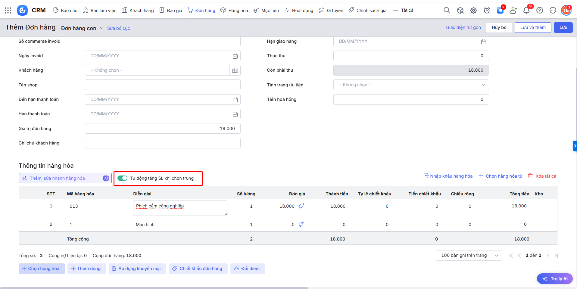 Bước 1: Ở bảng Thông tin hàng hóa của Đơn hàng\Tích chọn Bật Tự động tăng SL khi chọn trùng.