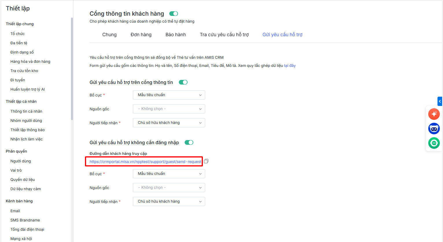 - Hướng dẫn cách bật và cấu hình chức năng trong phần Thiết lập Cổng thông tin trên AMIS CRM.