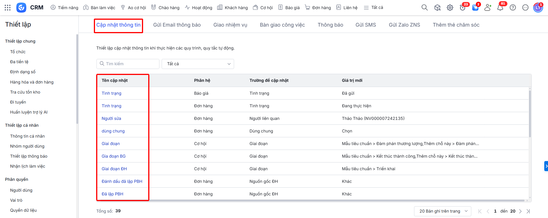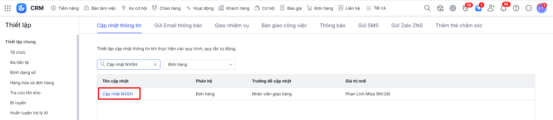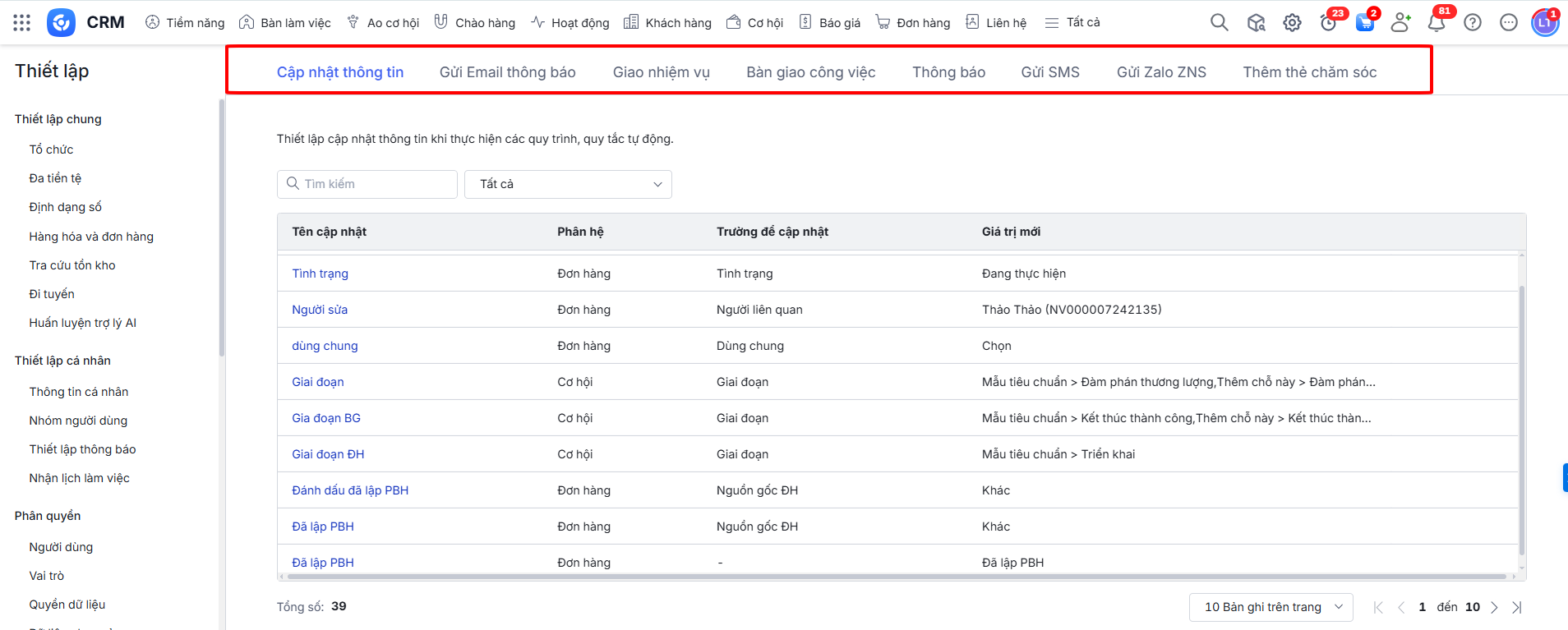 Bước 2: Có 8 tab tương ứng với 8 hành động trong quy trình tự động phần mềm đang cung cấp: Cập nhật thông tin, Gửi email thông báo, Giao nhiệm vụ, Bàn giao công việc, Thông báo, Gửi SMS, Gửi Zalo ZNS, Thêm thẻ chăm sóc.