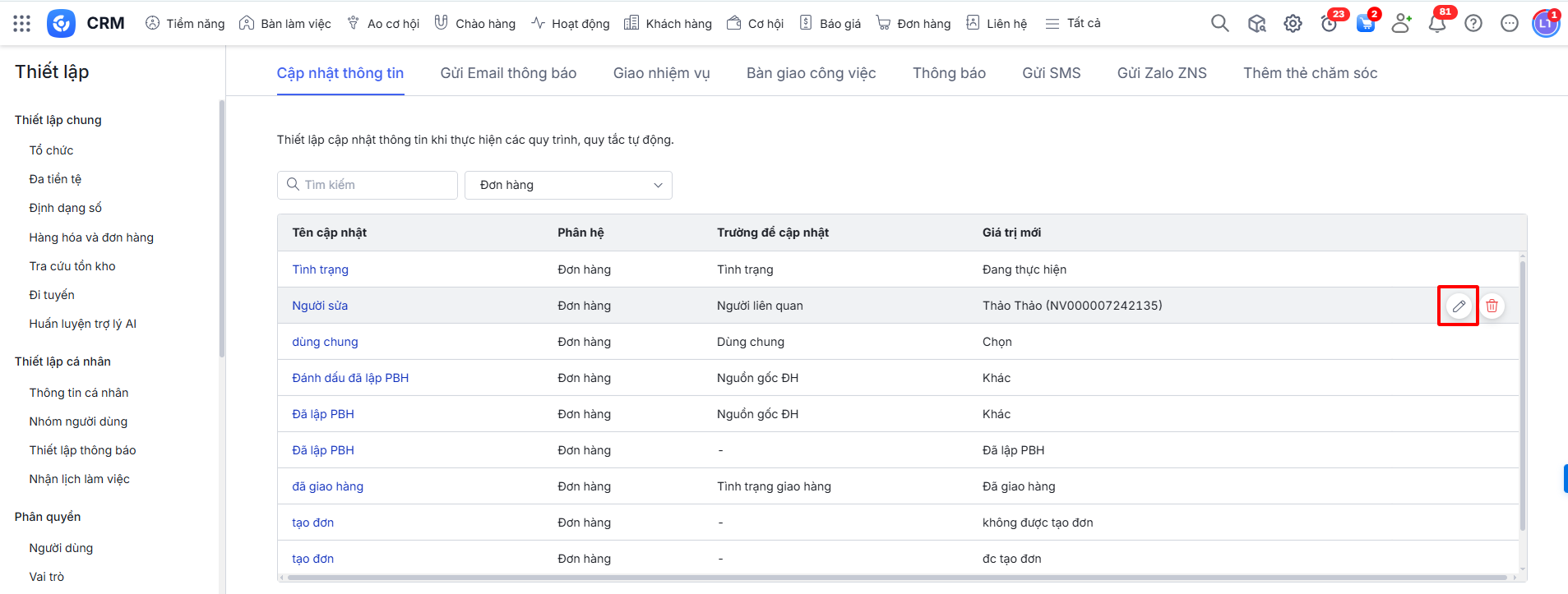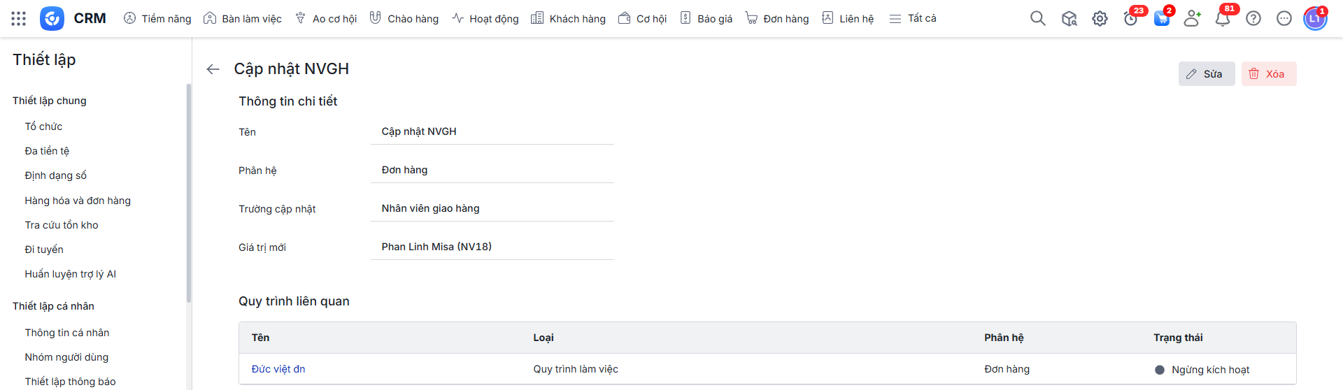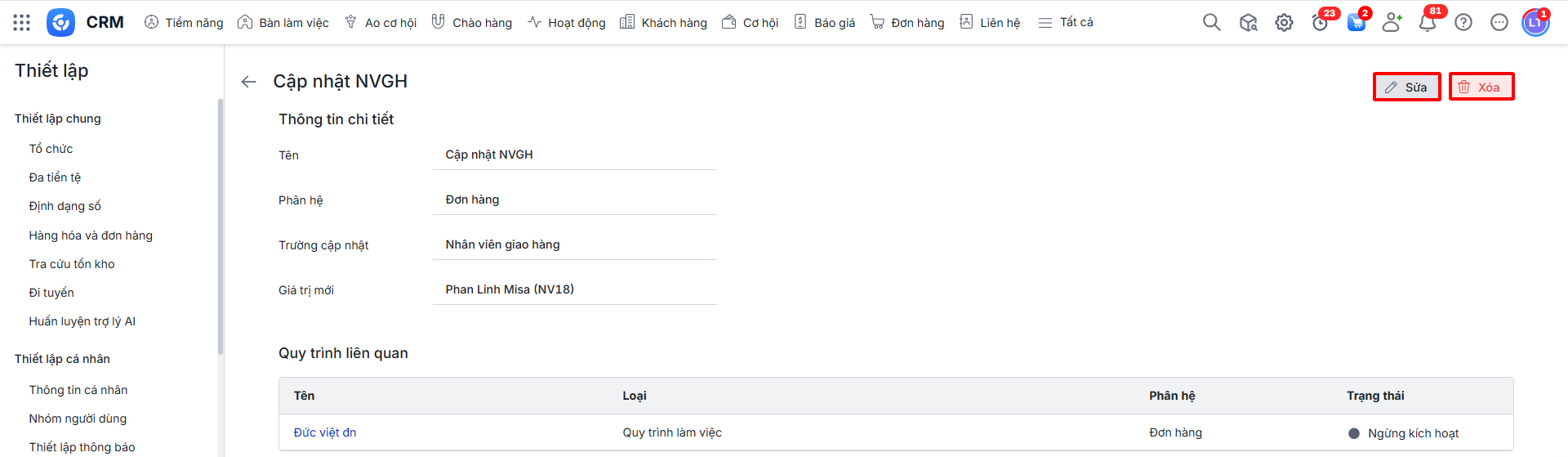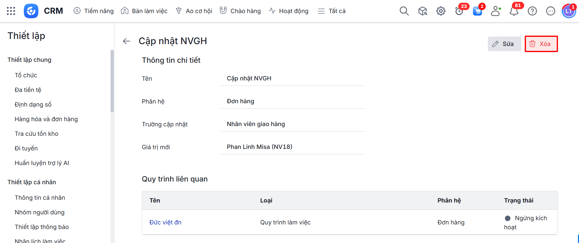 Lưu ý: Không xóa được các hành động liên quan đến quy trình tự động đã thiết lập.