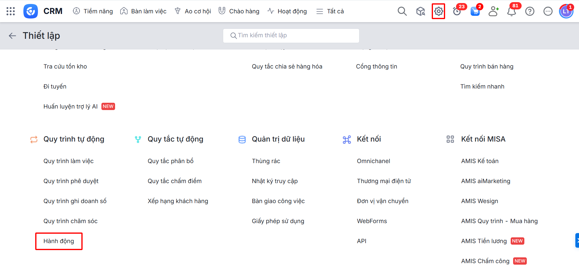 Bước 1: Trên AMIS CRM, nhấn biểu tượng bánh răng để hiển thị Thiết lập \ vào Quy trình tự động \ chọn Hành động.