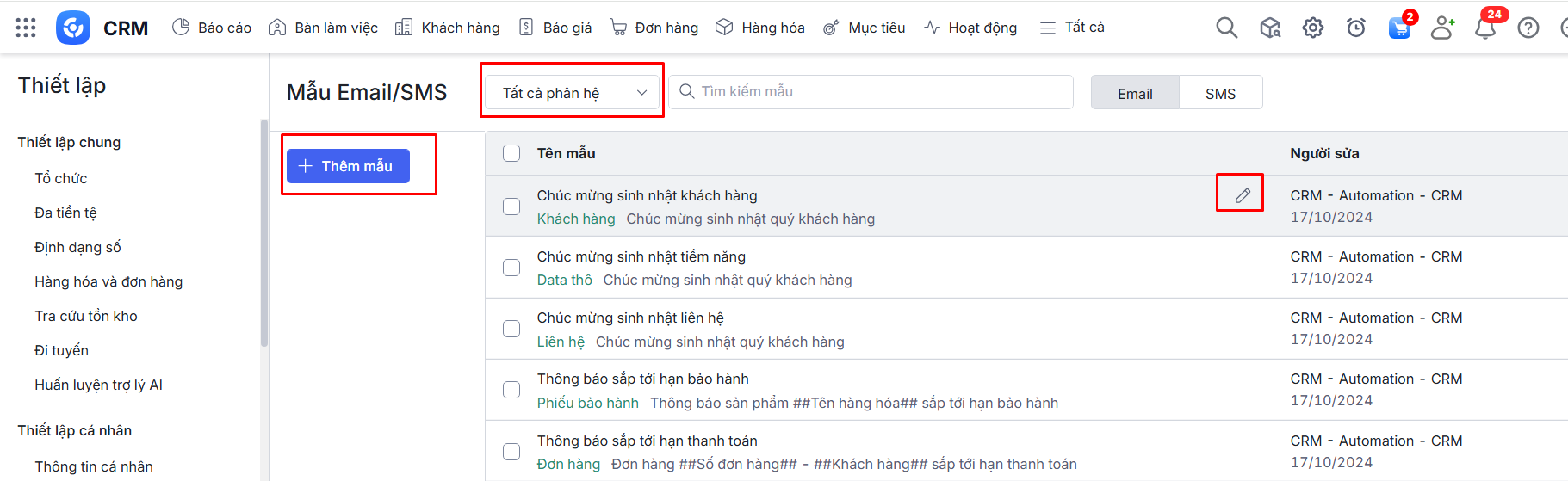 Bước 3: Chọn phân hệ muốn thiết lập mẫu mail\ Di chuột vào đầu mẫu cần sửa để hiện thị biều tượng cây bút hoặc Nhấn thêm mẫu.