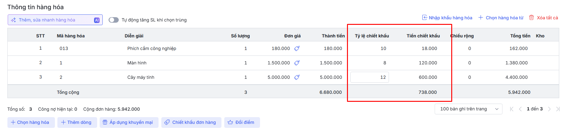 Lưu ý: Để hiển thị những thông tin này, cần thiết lập Hiển thị Đơn giá chiết khấu, Thành tiền chiết khấu tại đây.