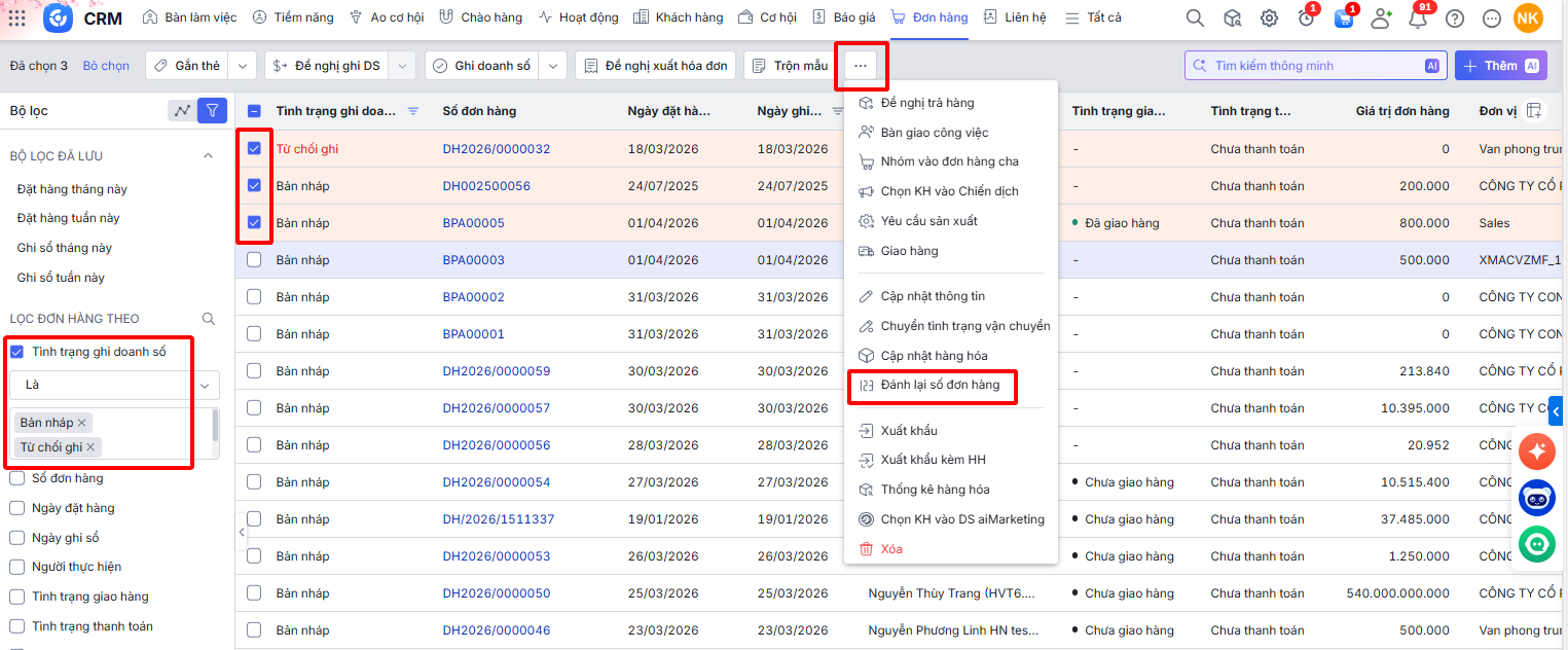 2.2. Đánh lại số đơn hàng cho các đơn hàng ở trạng thái Đề nghị ghi, Đã ghi doanh số, hoặc đã Gửi yêu cầu sản xuất.