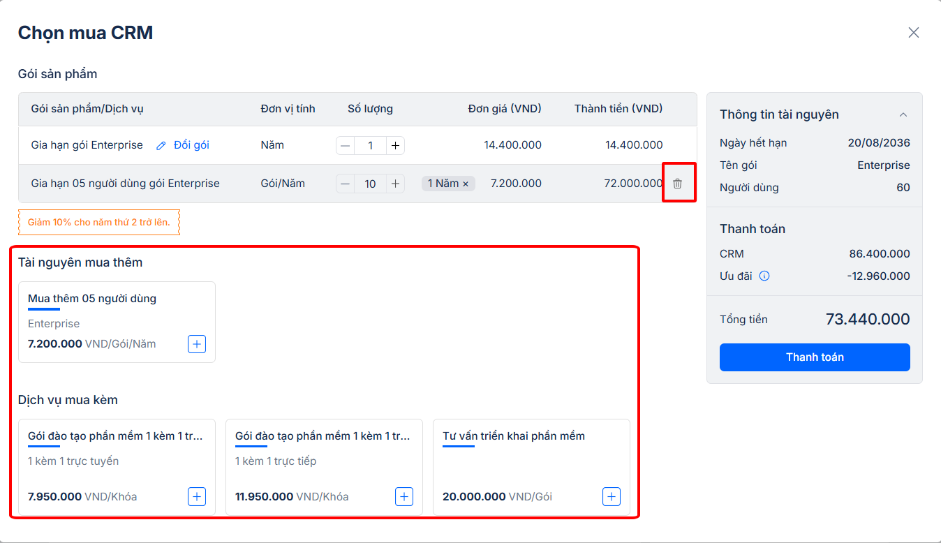 Bước 3: Chọn mua thêm người dùng (ở mục Tài nguyên mua thêm), mua thêm gói đào tạo (ở mục Dịch vụ mua kèm). Sau đó nhấn Thanh toán.