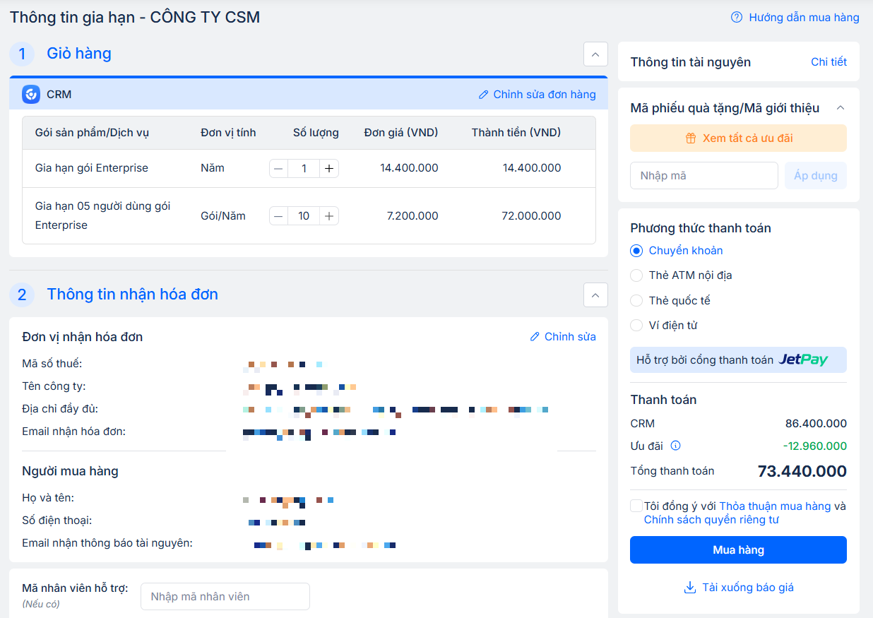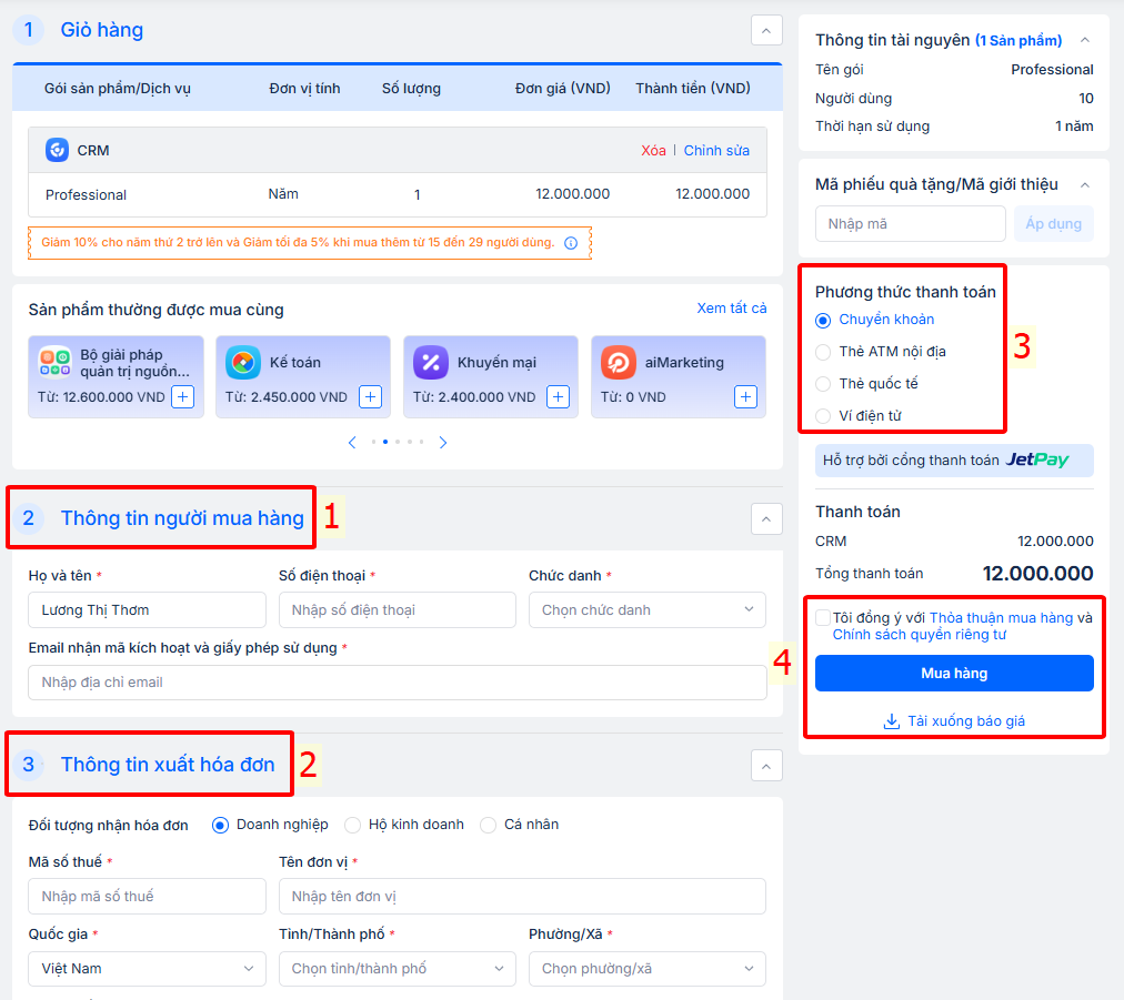 - Thông tin mua hàng: khai báo các thông tin cần thiết để hoàn tất việc mua phần mềm.