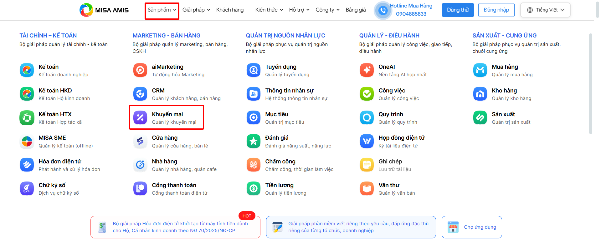 Bước 1: Truy cập vào website giới thiệu Nền tảng quản trị doanh nghiệp MISA AMIS http://amis.misa.vn. Sau đó chọn mục Sản phẩm và chọn sản phẩm AMIS Khuyến mại.