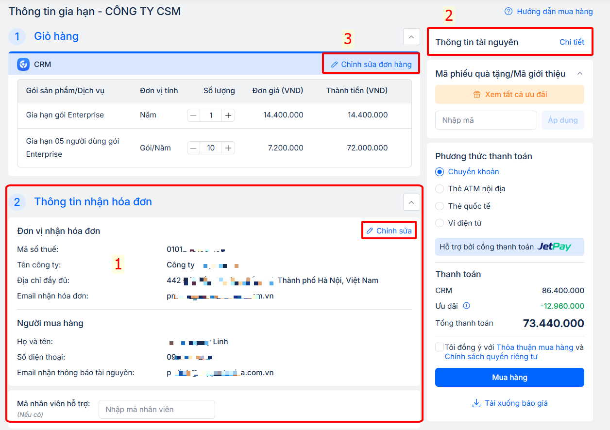 Bước 4: Nếu cần thay đổi tài nguyên nhấn Chỉnh sửa đơn hàng: