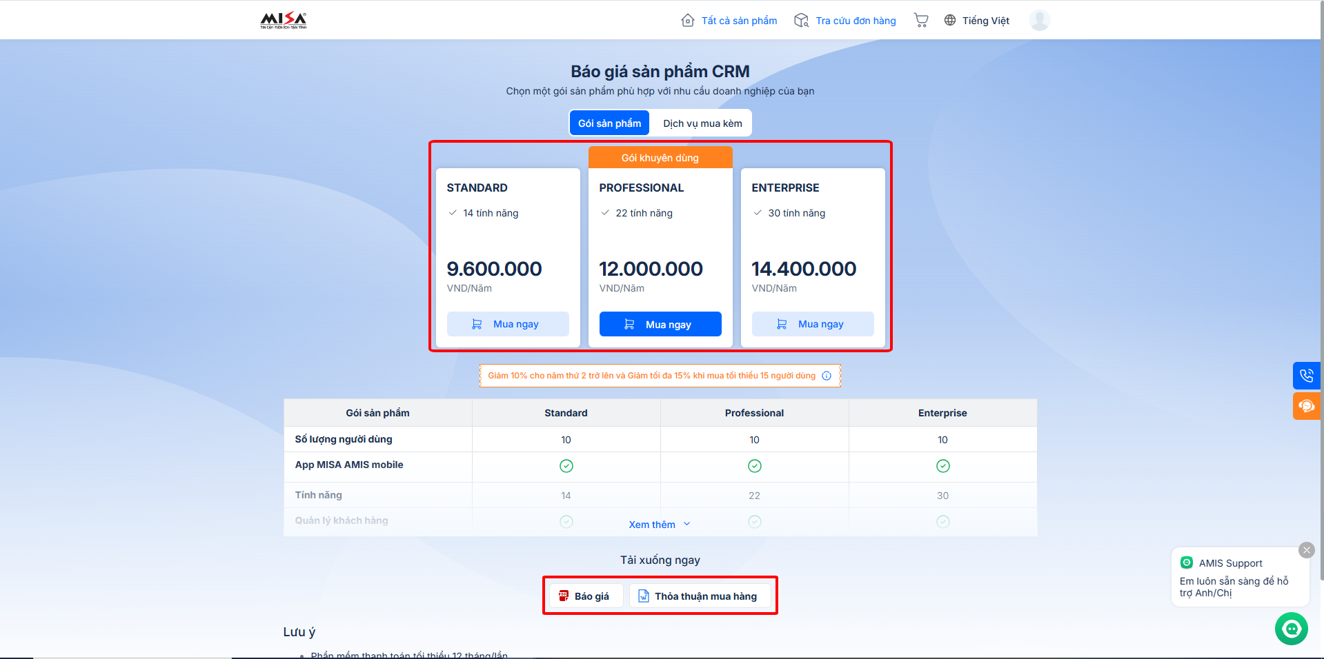 Bước 2: Ở trang Báo giá sản phẩm, chọn gói sản phẩm phù hợp và nhấn Mua ngay.
