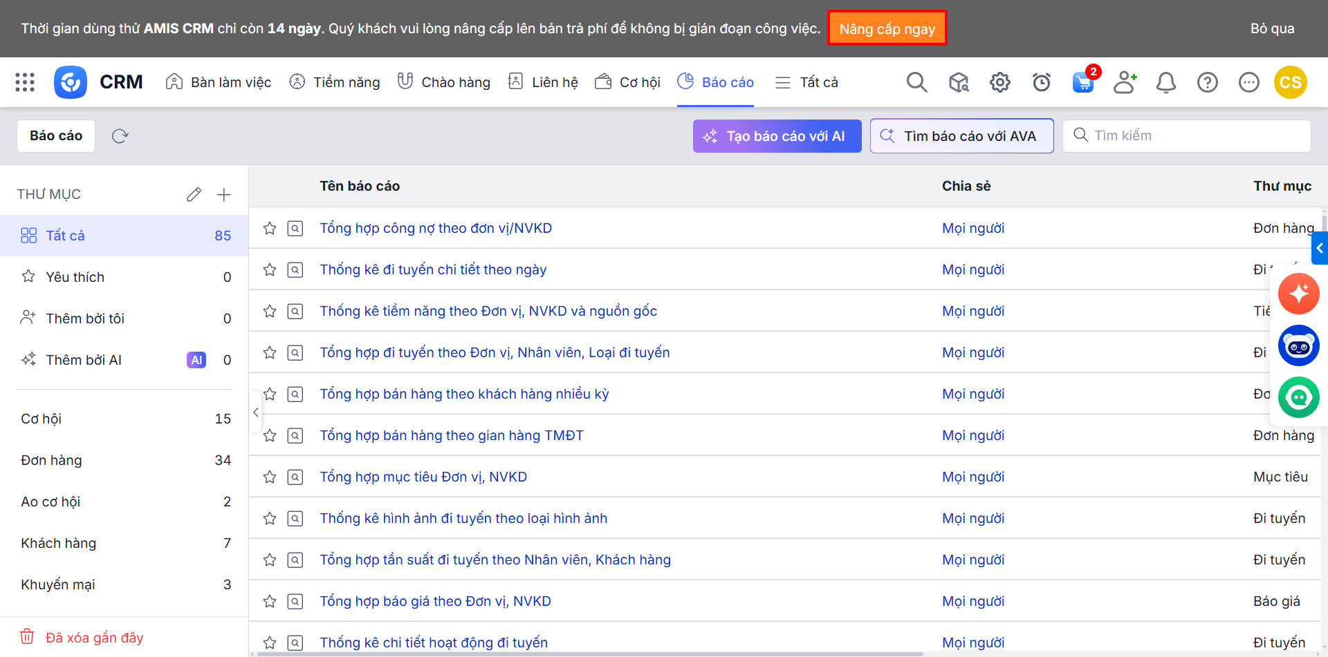 Bước 1: Khi đăng ký dùng thử AMIS CRM, trên giao diện phần mềm sẽ xuất hiện nút Nâng cấp ngay \ nhấn Nâng cấp ngay để tiến hành mua gói dịch vụ và tiếp tục sử dụng AMIS CRM.