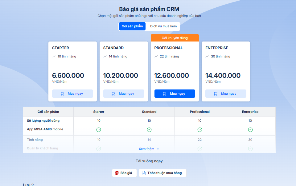 Bước 2: Ở trang Báo giá sản phẩm, chọn gói sản phẩm phù hợp và nhấn Mua ngay.