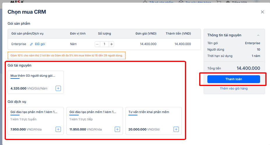 Bước 3: Chọn mua thêm người dùng (ở mục Tài nguyên mua thêm), mua thêm gói đào tạo (ở mục Dịch vụ mua kèm). Sau đó nhấn Thanh toán.