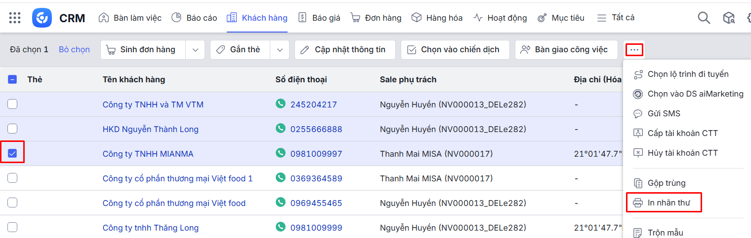 Bước 1: Ở màn hình danh sách Khách hàng\Tích chọn một hoặc một số Khách hàng muốn In nhãn thư\Nhấn biểu tượng dấu ba chấm