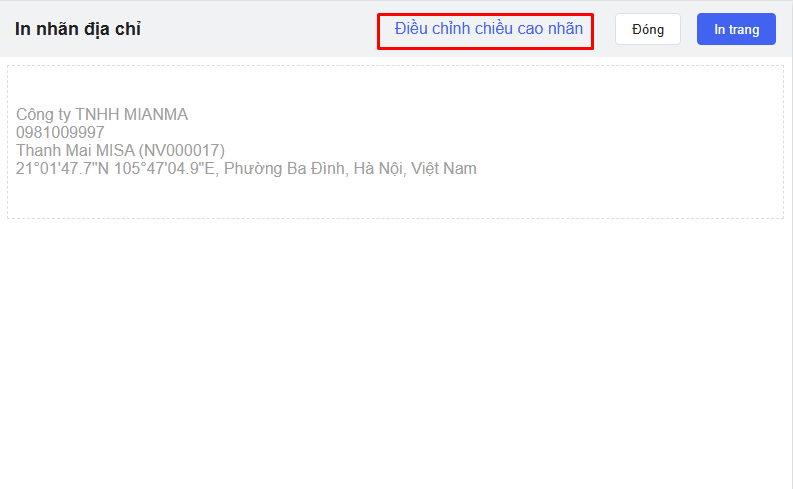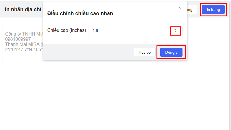 Bước 3: Tùy chỉnh độ cao nhãn\Đồng ý\Nhấn In trang để thực hiện in nhãn thư.