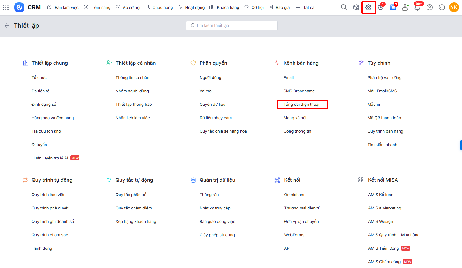 Sau khi kết nối, anh/chị sử dụng tổng đài điện thoại VOIP24H trên AMIS CRM để gọi đi cho khách hàng, nhận cuộc gọi đến, xem lịch sử cuộc gọi. Xem hướng dẫn tại đây.