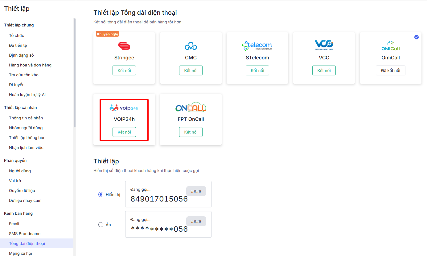 Lưu ý: AMIS CRM chỉ hỗ trợ gọi điện bằng tổng đài VOIP24H trên 1 tab/1 trình duyệt/1 thiết bị.