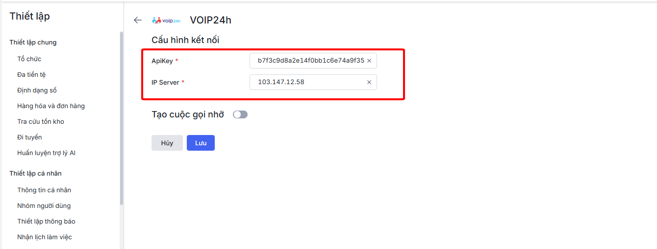 Bước 3: Ở mục Cấu hình kết nối, khai báo ApiKey, IP Server do VOIP24H cung cấp.